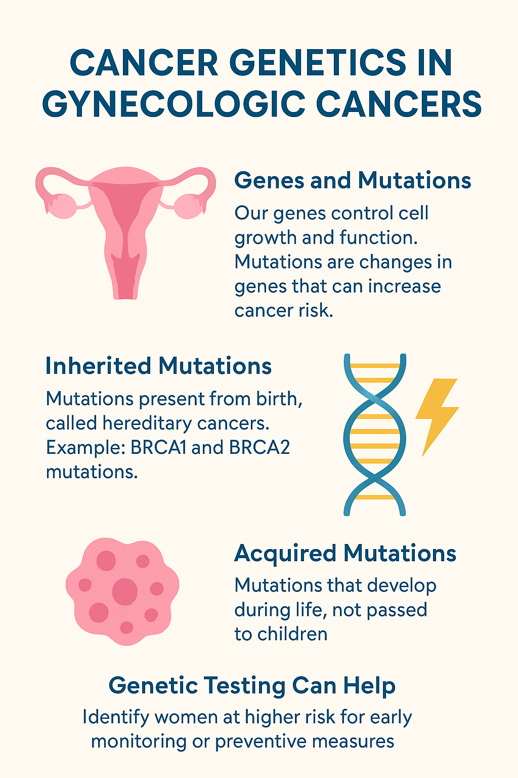 Our genes act like an instruction manual for our body, controlling how cells grow and function. Sometimes, certain changes in these genes, called mutations, can increase the risk of cancers, including those affecting a woman’s reproductive organs such as the ovaries, uterus, and cervix. Some mutations are inherited from parents,