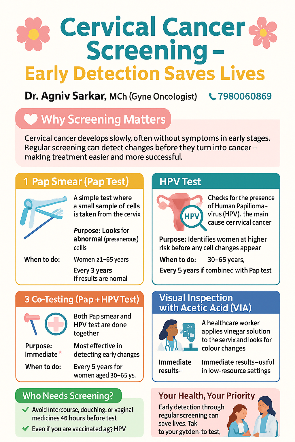 Cervical cancer is a preventable disease that occurs when abnormal cells develop in the cervix, the lower part of the uterus. Early detection through screening can save lives by identifying changes before they progress to cancer. The two main screening methods are the Pap smear and the HPV (Human Papillomavirus)
