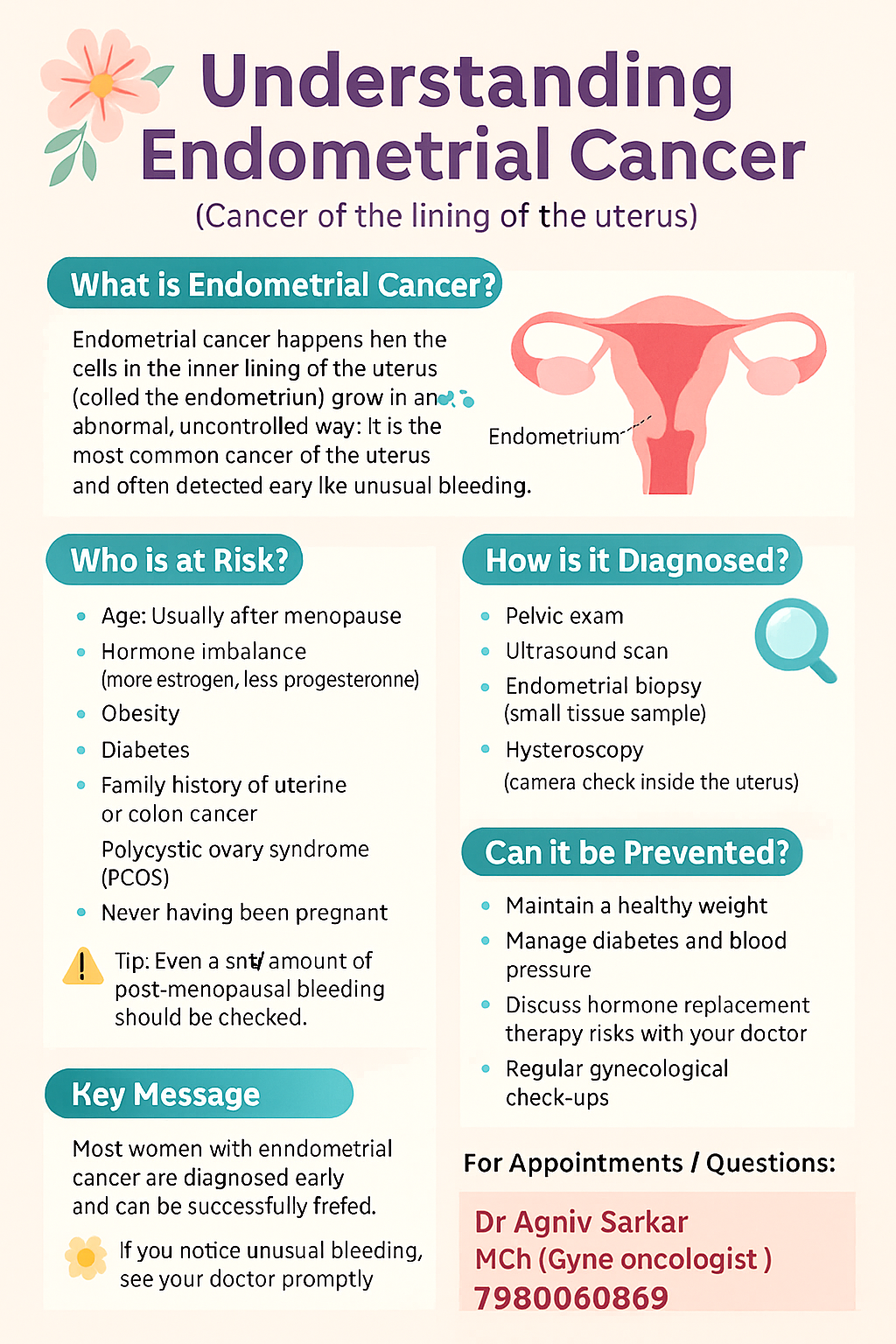 Endometrial cancer is a type of cancer that starts in the lining of the uterus, called the endometrium. It is the most common cancer of the female reproductive system, usually affecting women after menopause, though it can occur earlier. The main symptom is abnormal vaginal bleeding — especially bleeding after