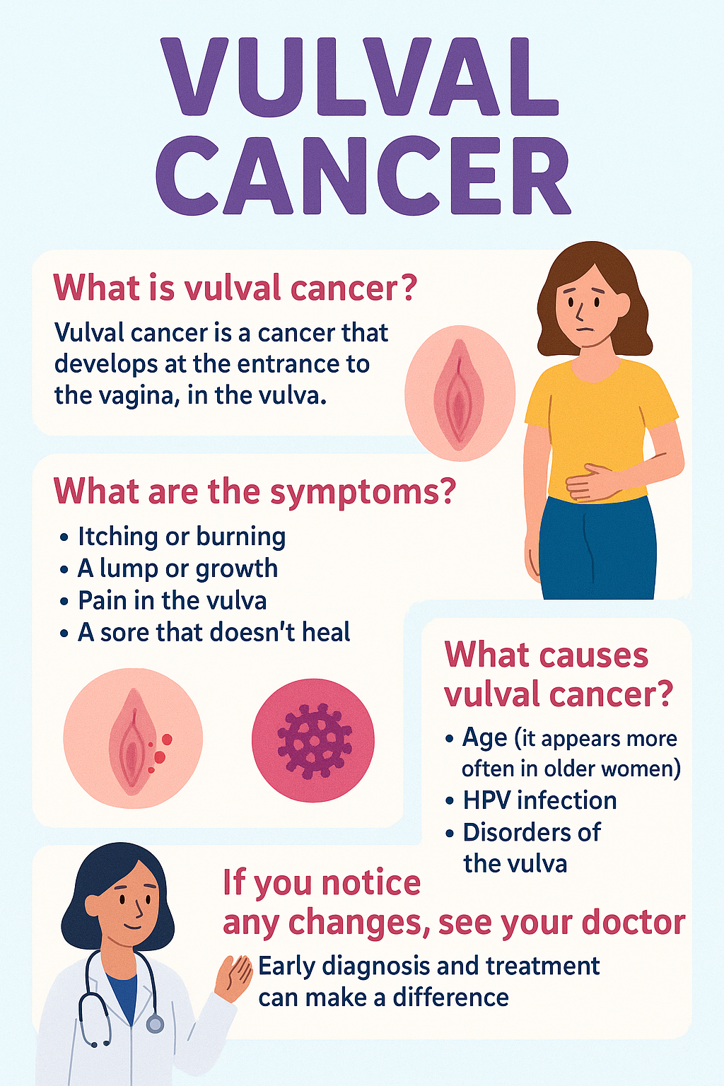 Vulval cancer is an uncommon type of cancer that develops on the outer part of the female genital area, called the vulva. This area includes the skin around the opening of the vagina, the inner and outer lips (labia), and the clitoris. It most often affects women after menopause, but