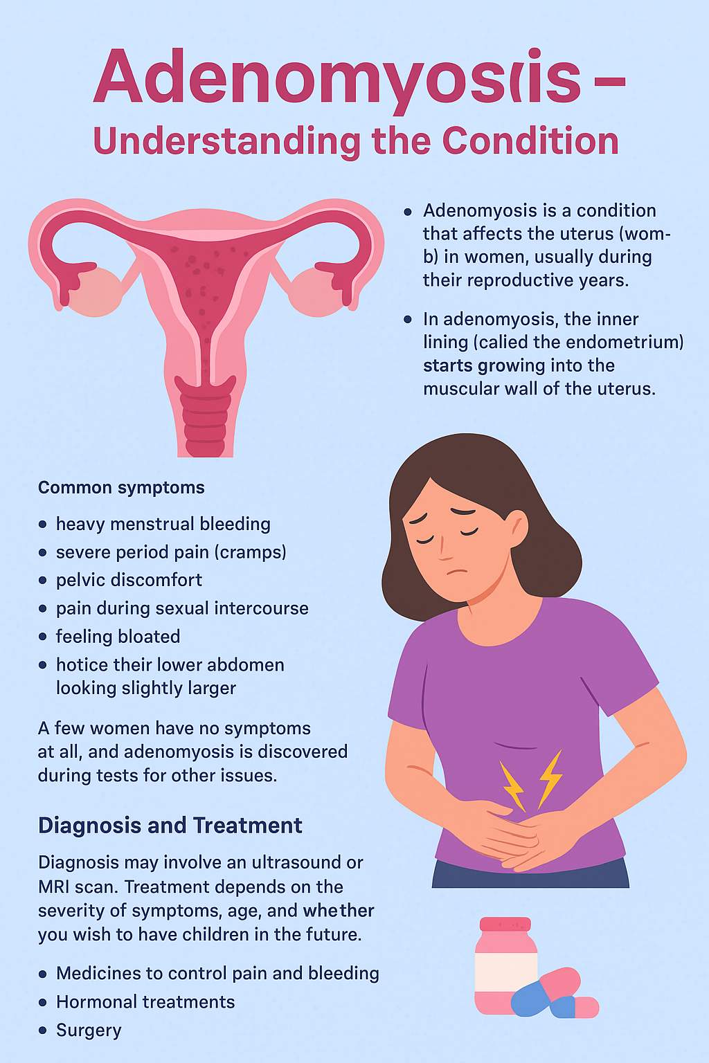 Adenomyosis is a condition that affects the uterus (womb) in women, usually during their reproductive years. In a healthy uterus, the inner lining (called the endometrium) grows and sheds during the menstrual cycle. In adenomyosis, this lining starts growing into the muscular wall of the uterus. This can make the