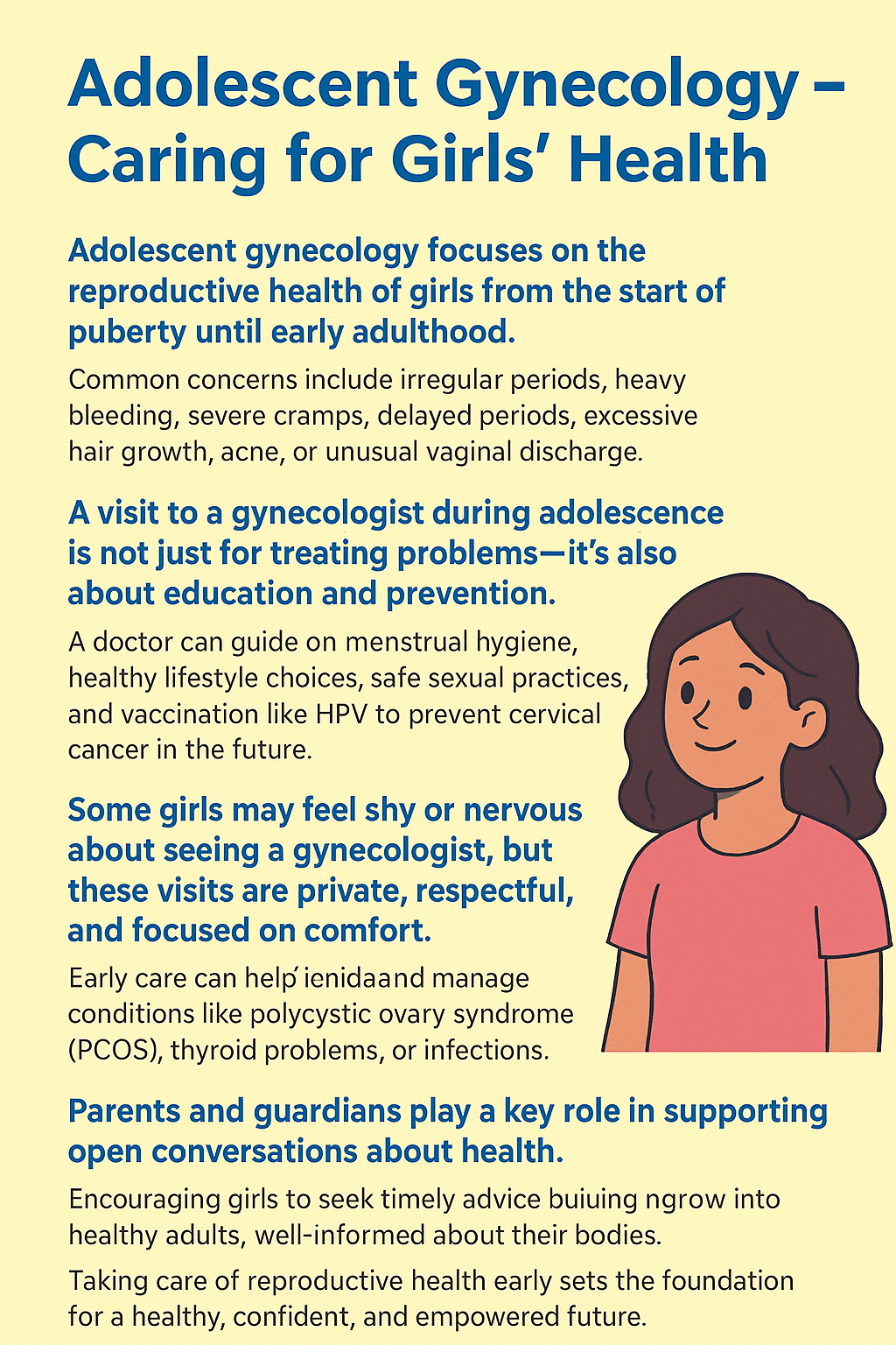 Adolescent gynecology focuses on the reproductive health of girls from the start of puberty until early adulthood. This is an important stage in life when the body undergoes many physical and emotional changes. Common concerns include irregular periods, heavy bleeding, severe cramps, delayed periods, excessive hair growth, acne, or unusual