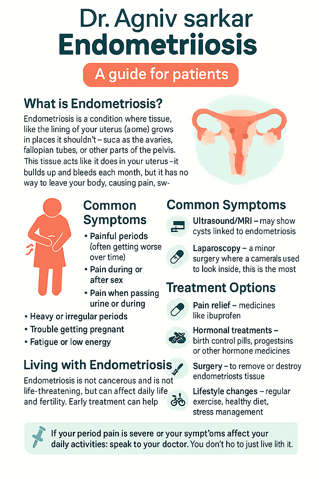 Endometriosis is a condition where tissue similar to the lining of the uterus (womb) grows outside it, such as on the ovaries, fallopian tubes, or other pelvic organs. This tissue behaves like the normal lining – it thickens and bleeds with each menstrual cycle – but the blood has no