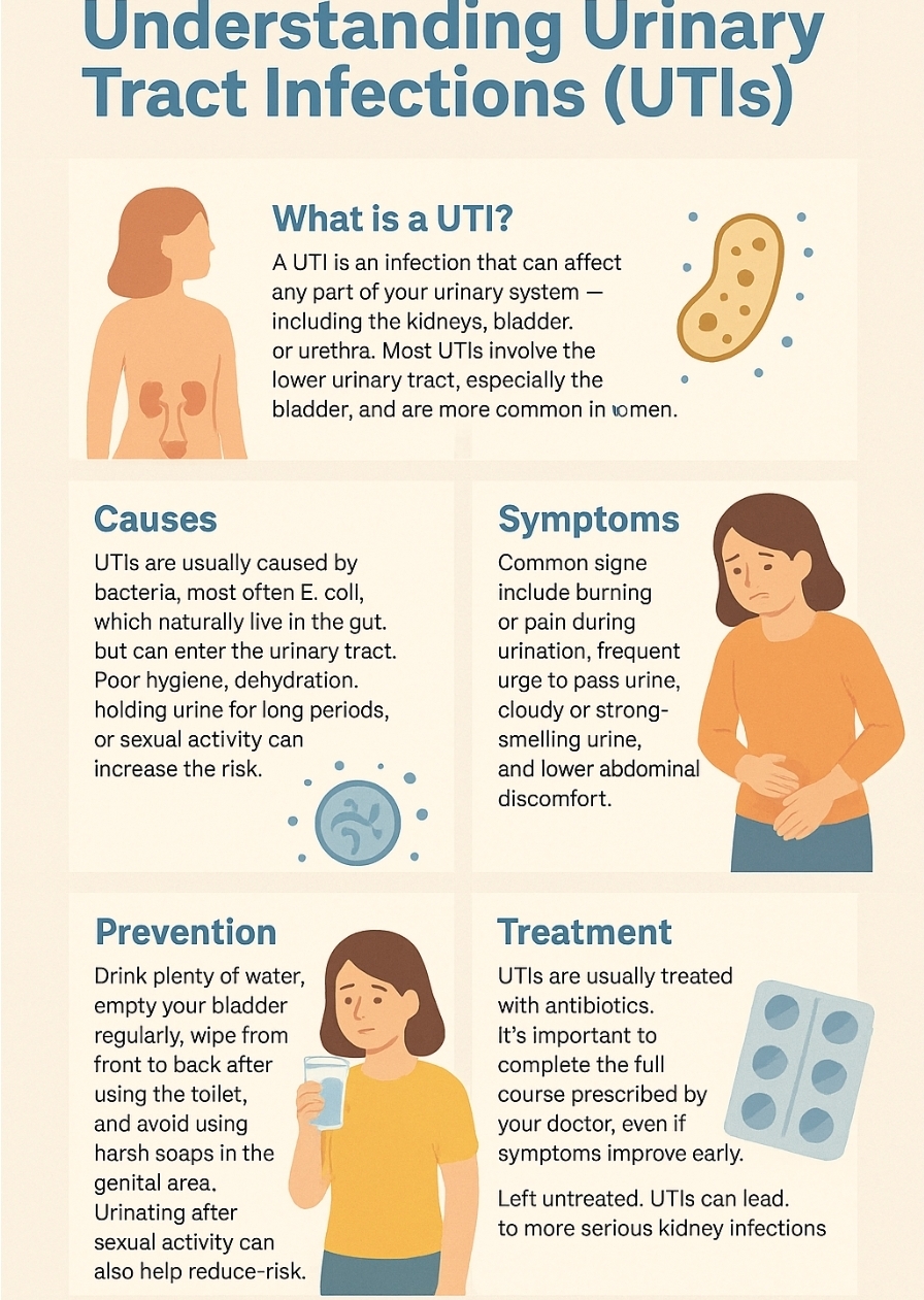 A urinary tract infection (UTI) is an infection that can affect any part of your urinary system — including the kidneys, bladder, or urethra. Most UTIs involve the lower urinary tract, especially the bladder, and are more common in women. Causes: UTIs are usually caused by bacteria, most often E.