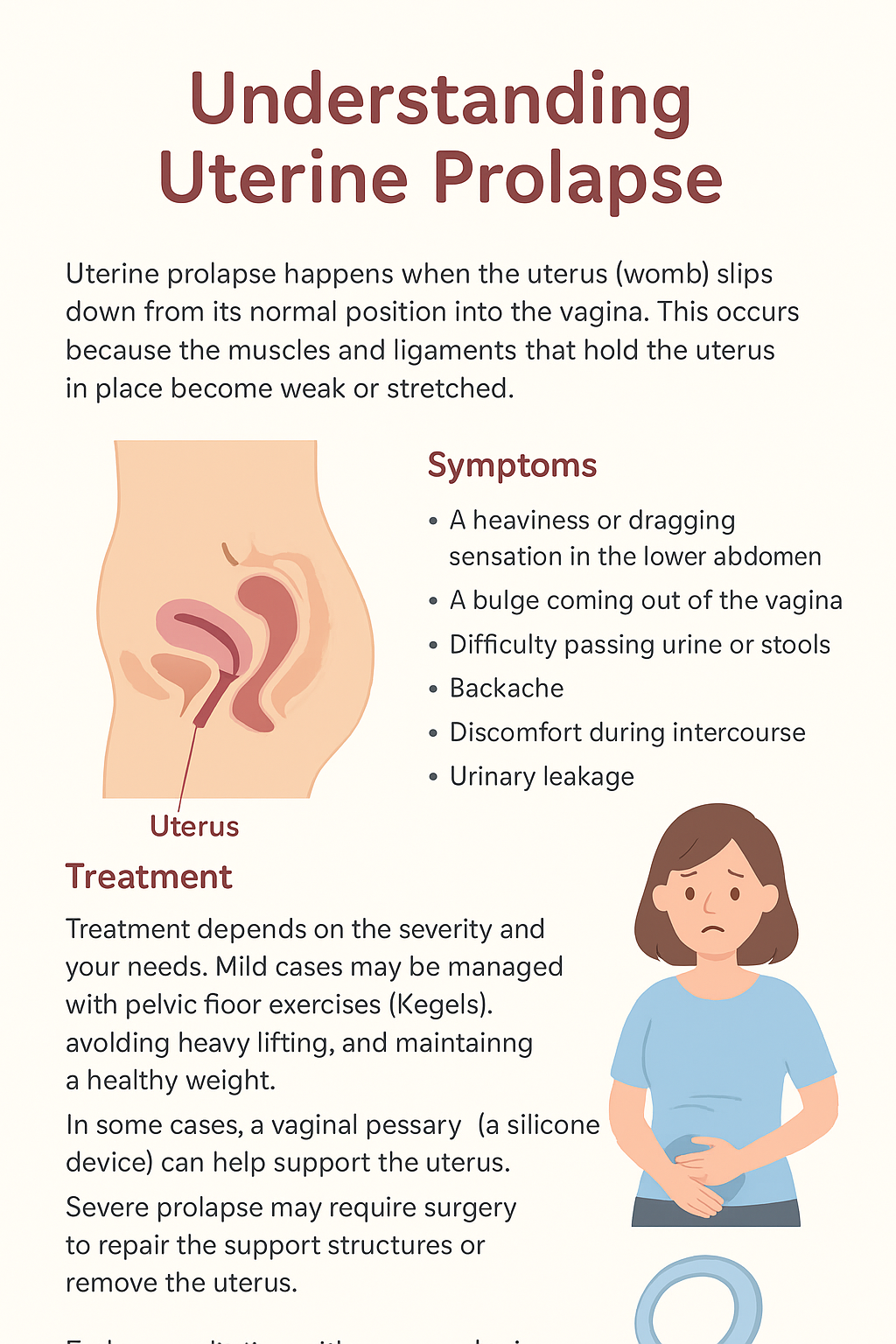 Uterine prolapse happens when the uterus (womb) slips down from its normal position into the vagina. This occurs because the muscles and ligaments that hold the uterus in place become weak or stretched. It is more common in women who have had multiple normal deliveries, are post-menopausal, or have conditions