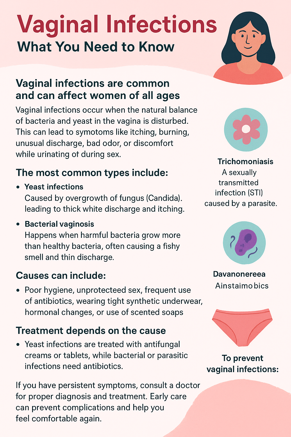 Vaginal infections are common and can affect women of all ages. They occur when the natural balance of bacteria and yeast in the vagina is disturbed. This can lead to symptoms like itching, burning, unusual discharge, bad odor, or discomfort while urinating or during sex. The most common types include: