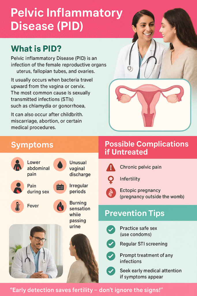 Symptoms of PID may include lower abdominal pain, unusual vaginal discharge, pain during sex, irregular periods, fever, or burning sensation while passing urine. However, some women may have mild or no symptoms, making it easy for the condition to go unnoticed.